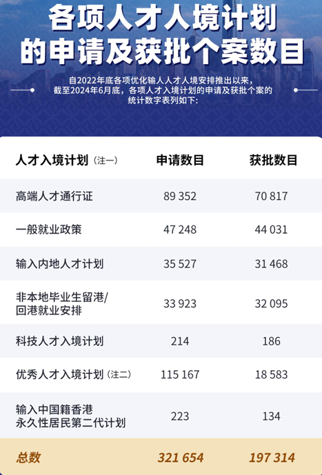 香港截至今年6 月底,各项已优化的人才入境计划共收到超过32万宗申请,已批出近20万宗,当中 超过13万名人才已到港。