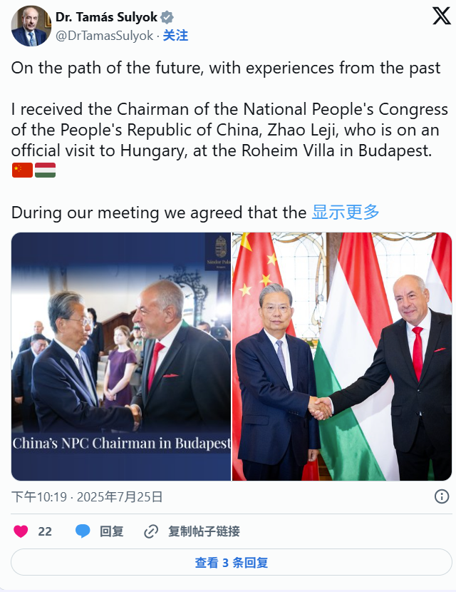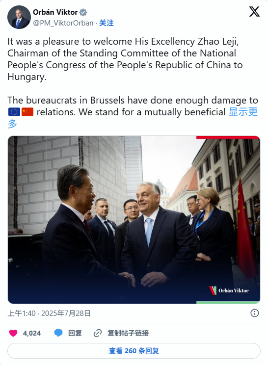 • 总理欧尔班:在 X 平台表示愿在“信任与尊重”基础上深化互利合作。