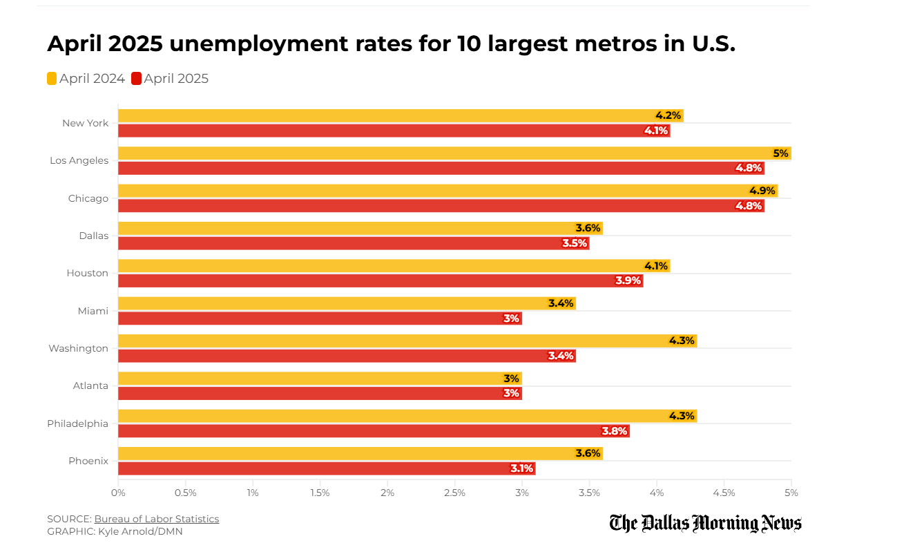 达拉斯-沃斯堡地区持续保持稳健的就业增长势头,在关税政策与通货膨胀引发经济逆风之际,展现出与联邦及州层面同步的韧性。美国劳工部周五数据显示,五月全美新增就业岗位13.9万个,虽较上月略有回落,但在摇摆不定的关税政策加剧增长担忧的背景下,仍超出预期。全国失业率稳定维持在4.2%水平。