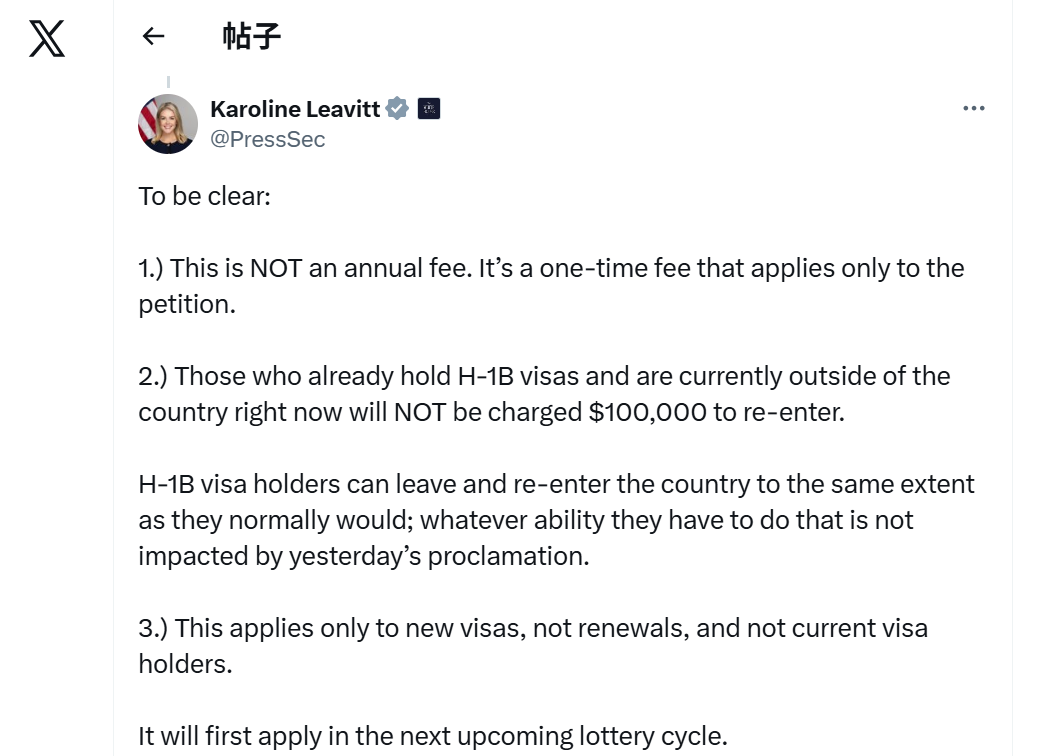 🎯 适用对象:仅适用于在2025年9月21日之后提交的、为身处美国境外的员工申请的新H-1B签证。
