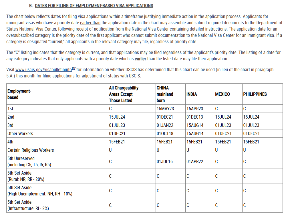 而表B代表的是递件排期,它主要是适用于那些希望在美国境内调整身份的申请人。对于不在美国境内的申请人而言,需要按照领馆处理流程来操作,这种情况下就应当参考表A。