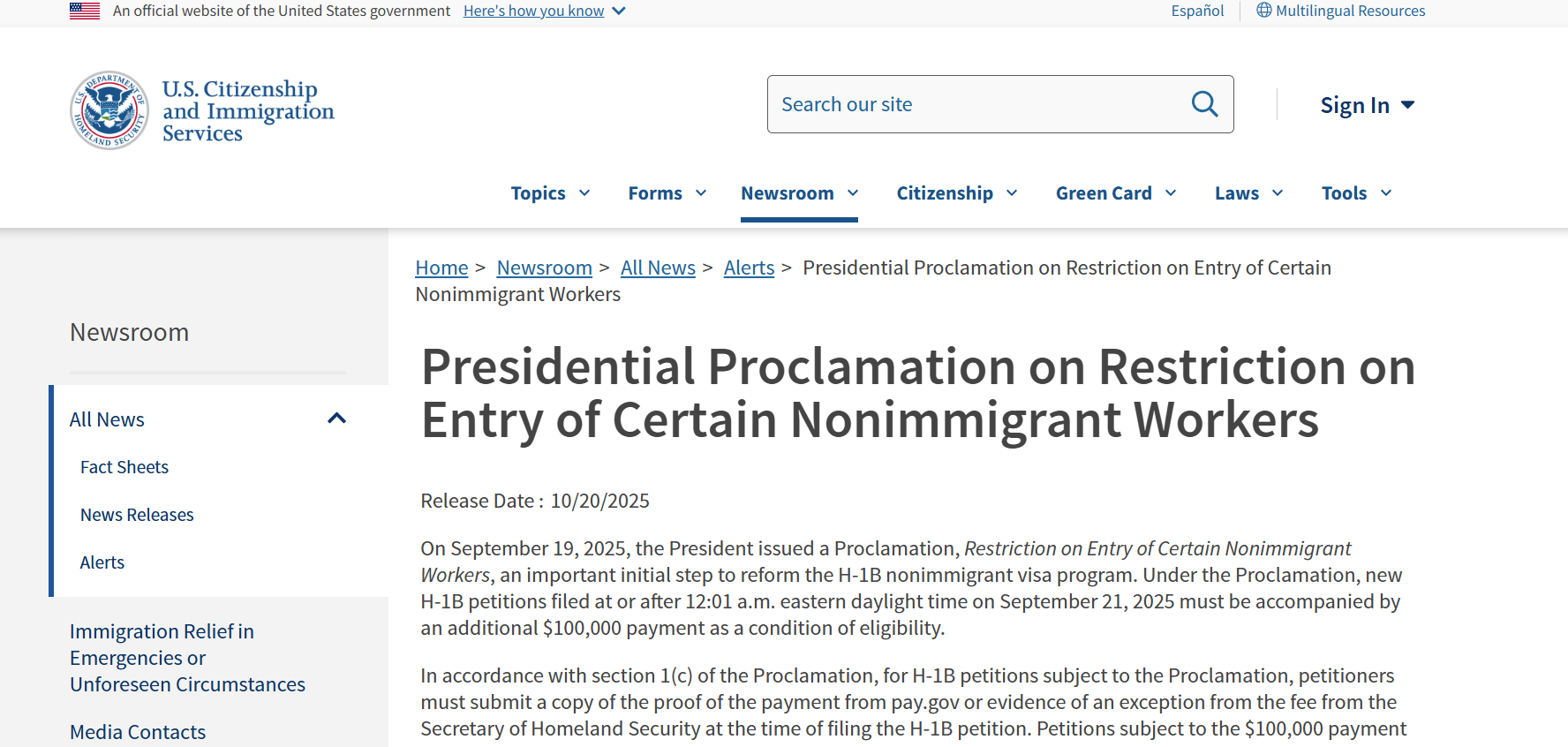 2025年10月20日,美国公民及移民服务局(USCIS)发布了H-1B签证10万美元新规。