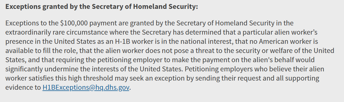 USCIS还补充说明,在“极其罕见的情况下”,如果国土安全部部长认定存在以下情况,则可以豁免10万美元的H-1B付款: