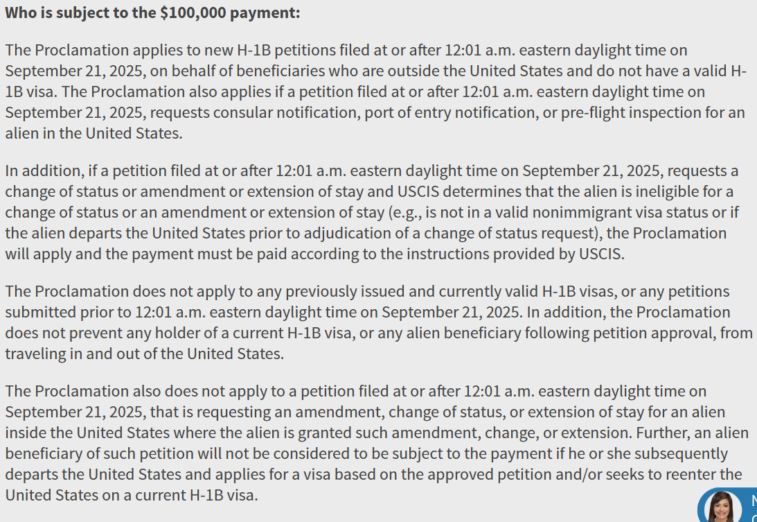 ✅境外新申请:在2025年9月21日或之后提交的新H-1B申请,且申请人身在美国境外,没有有效的H-1B签证。