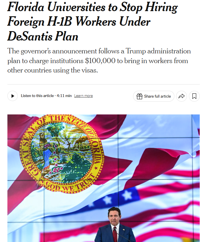 10月29日,佛罗里达州州长罗恩·德桑蒂斯(Ron DeSantis)正式宣布,要求佛州所有公立大学停止使用H-1B签证雇佣外籍员工。