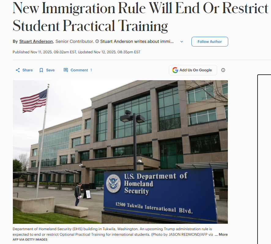 美东时间11月11日,美国各大主流媒体都在报道一件大事件——美国土安全部(DHS)宣布,美政府预计在2026年上半年出台新规,终止或限制国际学生OPT计划。
