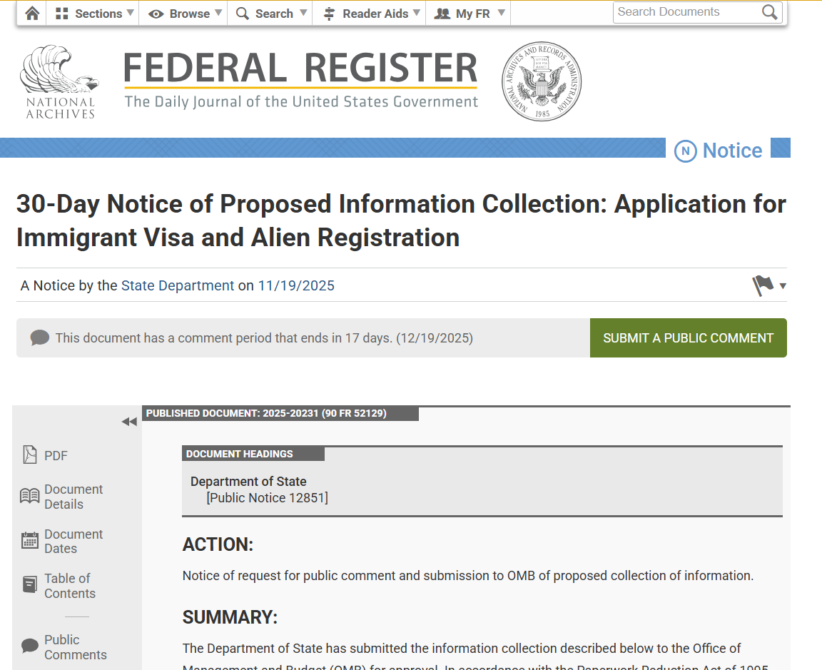 此前,美国国务院向管理和预算办公室(OMB)提交了修订电子版移民签证申请表DS-260(移民签证及外国人登记申请表)的提案。之前已进行过为期60天的意见征集期(在2025年9月8日结束)。