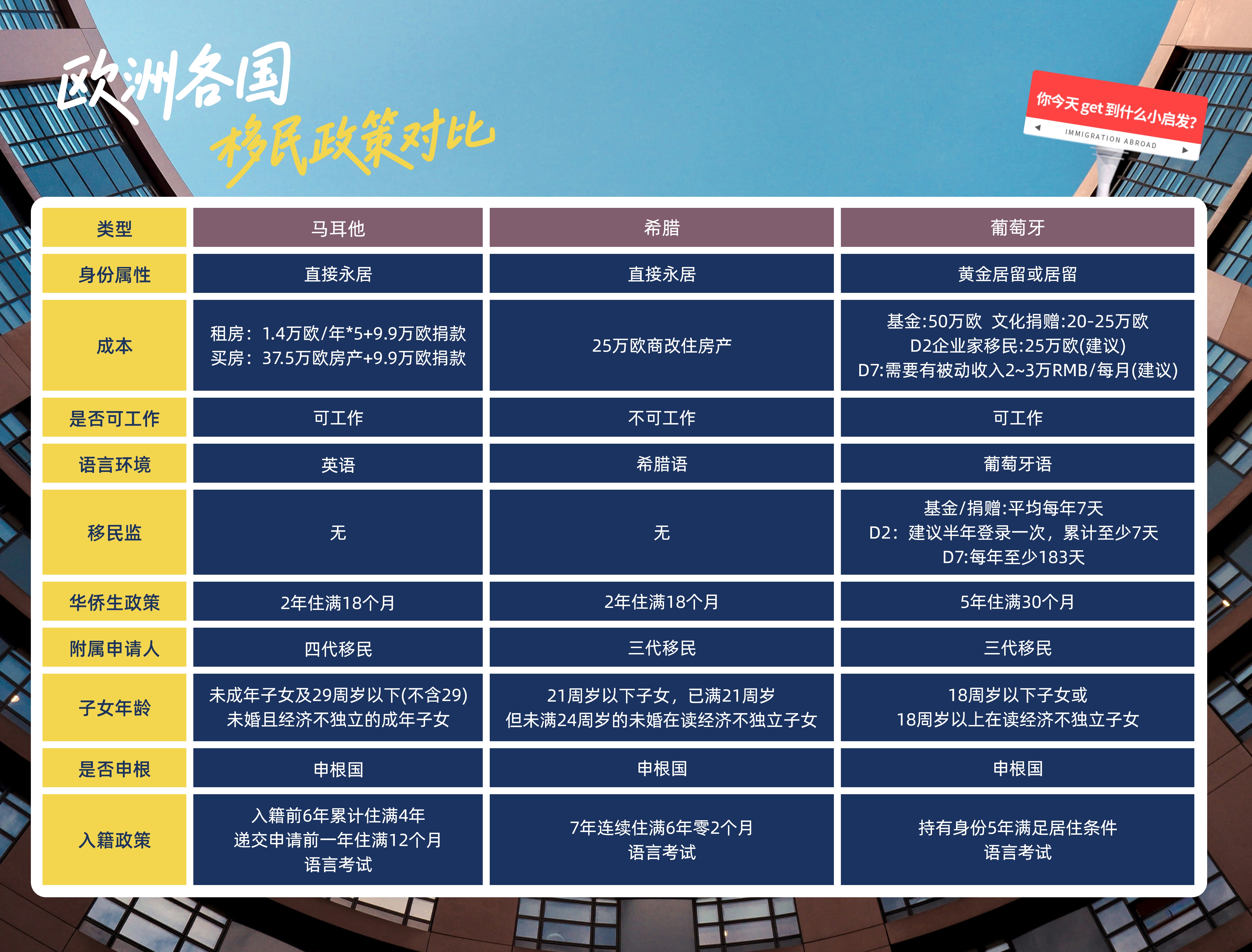相比马耳他、希腊等国家,葡萄牙的移民路径更加多样,像是一份可以按需选择的“菜单”——不同预算、不同需求的人,几乎都能找到适合自己的方式。