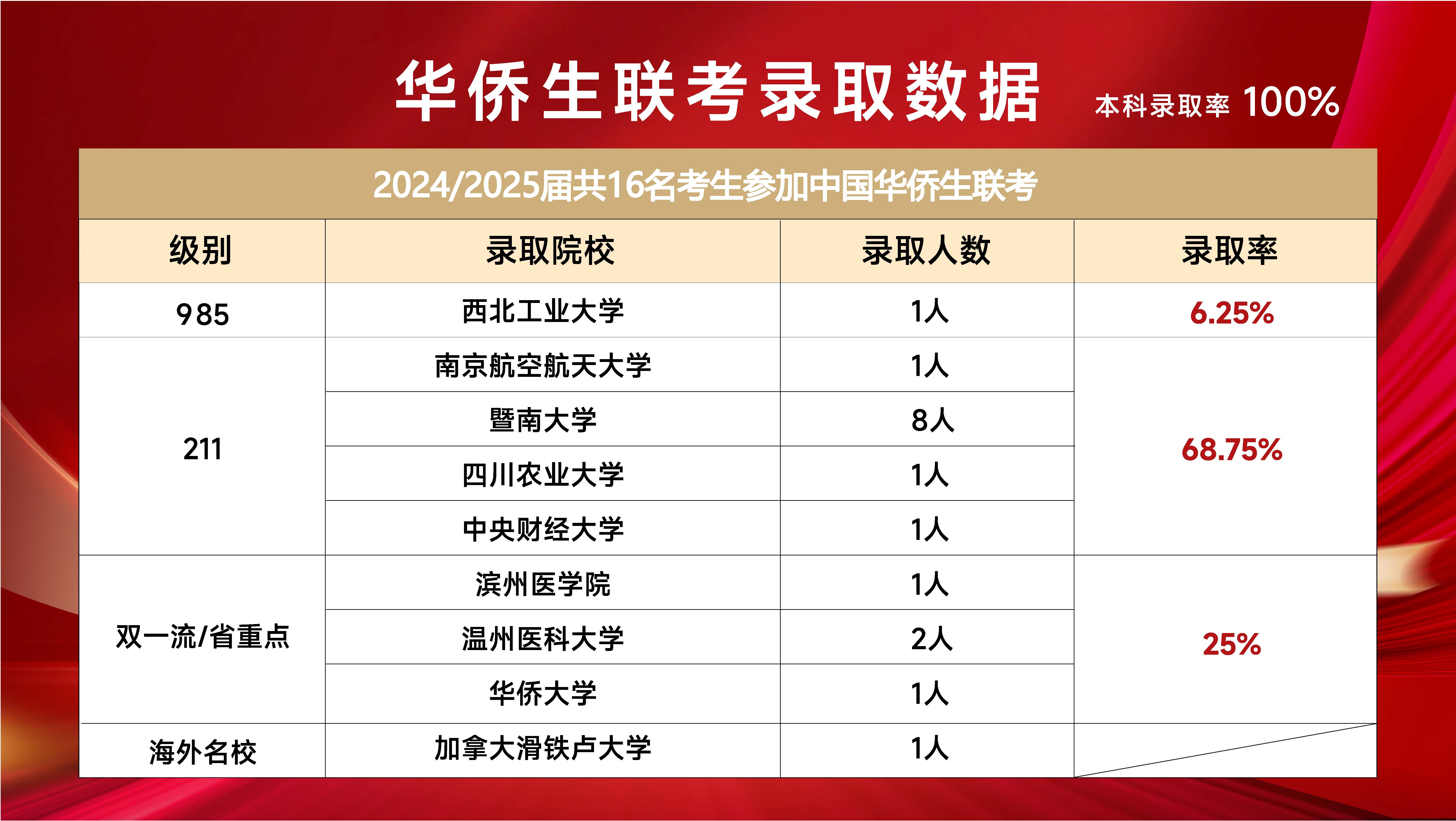 2024届华侨班的毕业生,报考成功率是100%。更硬核的是,75%的学生被国内985/211大学录取了。