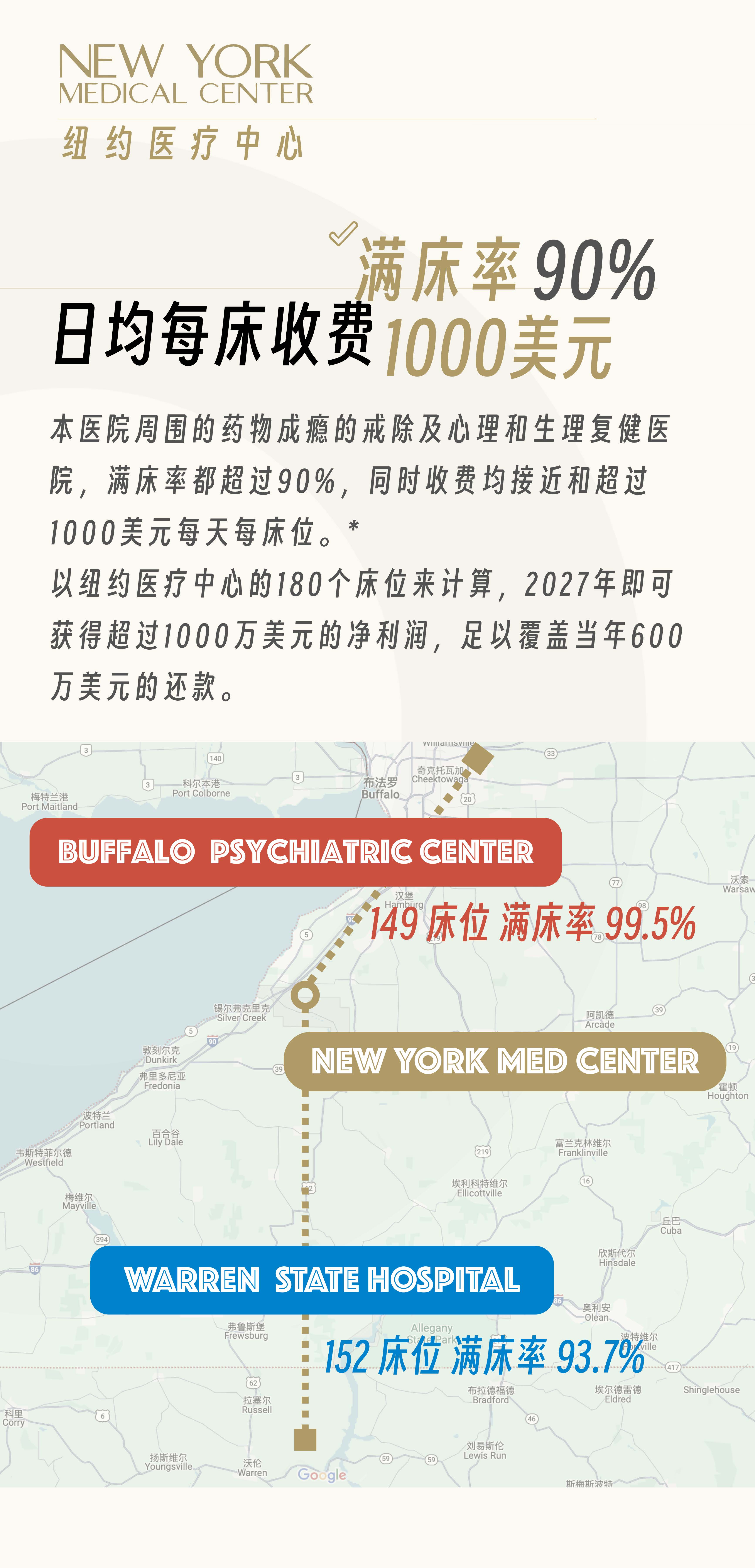 方案: 『纽约医疗中心』做的不是普通的地产开发,而是药物戒断和心理复健医疗服务。这正好填补了美国政府最头疼的医疗缺口。