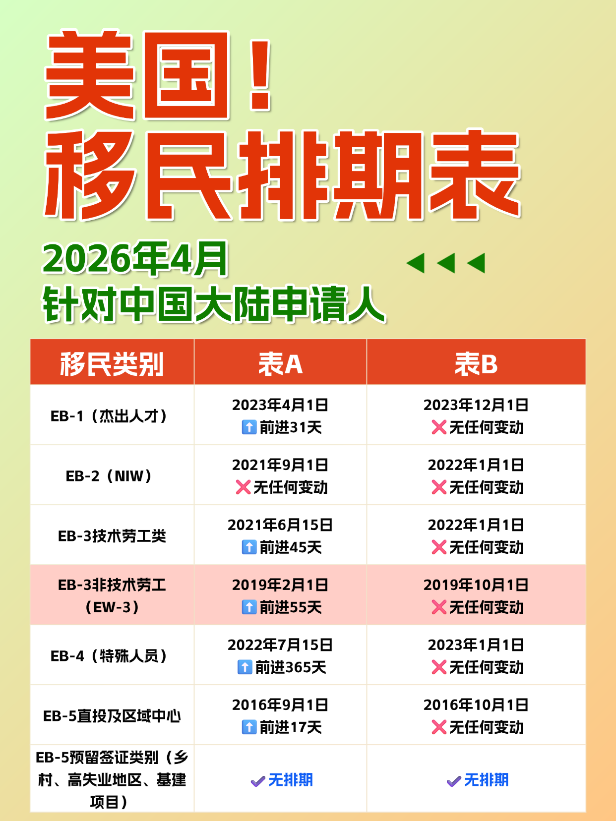 经历过前几个月的“按兵不动”之后,美国职业类排期终于有了新动静,而且不止一个类别,除EB-2之外,排期都在稳步前进。
