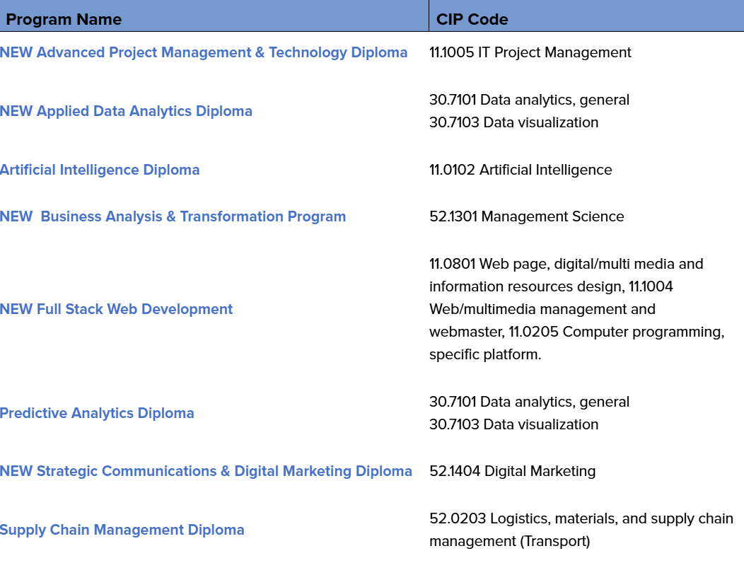1)战略传播与数字营销文凭Strategic Communications & Digital Marketing Diploma 2)供应链管理文凭Supply Chain Management Diploma 3)预测分析文凭 Predictive Analytics Diploma 4)全栈Web开发 Full Stack Web Development 5)业务分析与转型项目Business Analysis & Transformation Program 6)人工智能文凭 Artificial Intelligence Diploma 7)应用数据分析文凭 Applied Data Analytics Diploma 8)高级项目管理与技术文凭Advanced Project Management & Technology Diploma